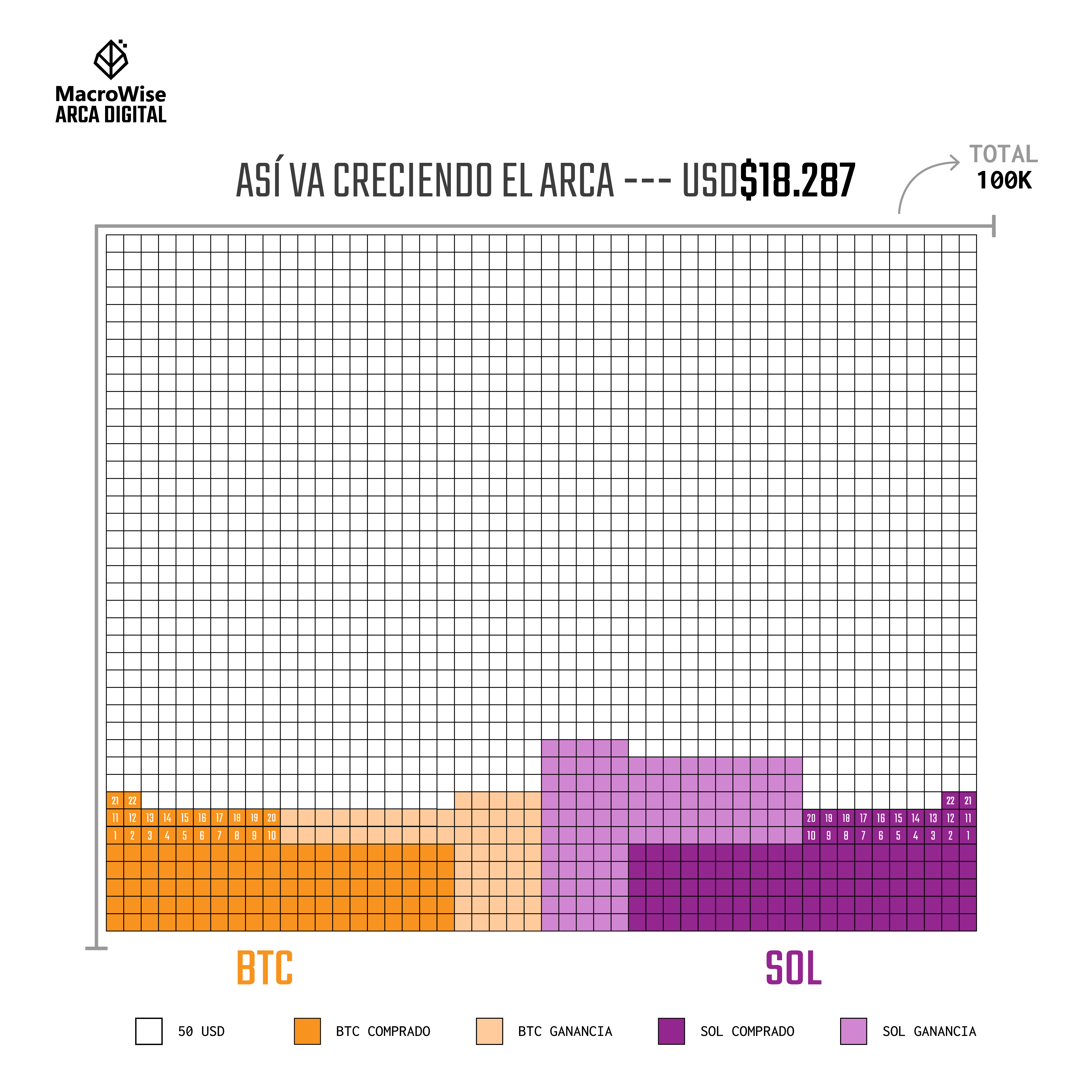 EL ARCA DIGITAL sigue creciendo. Lo que estamos haciendo desde MacroWise no es consejo de inversión, sino compartir nuestra experiencia. Invertimos US$ 5.000 en BTC y US$ 5.000 en SOLANA, y cada miércoles agregamos US$ 100. Comenzamos hace 22 semanas, y estos son nuestros resultados hasta ahora.