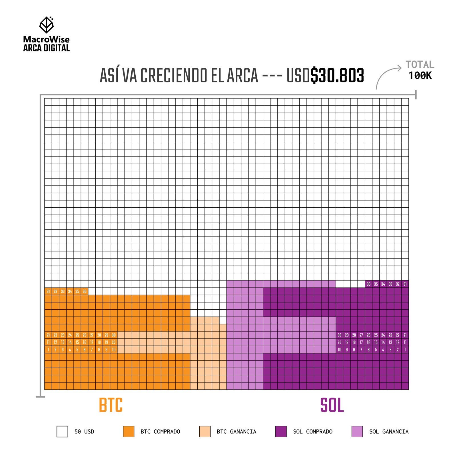 Hoy compramos US$100, divididos en US$50 para Bitcoin (BTC) y US$50 para Solana (SOL). Aquí el consolidado de nuestras compras.