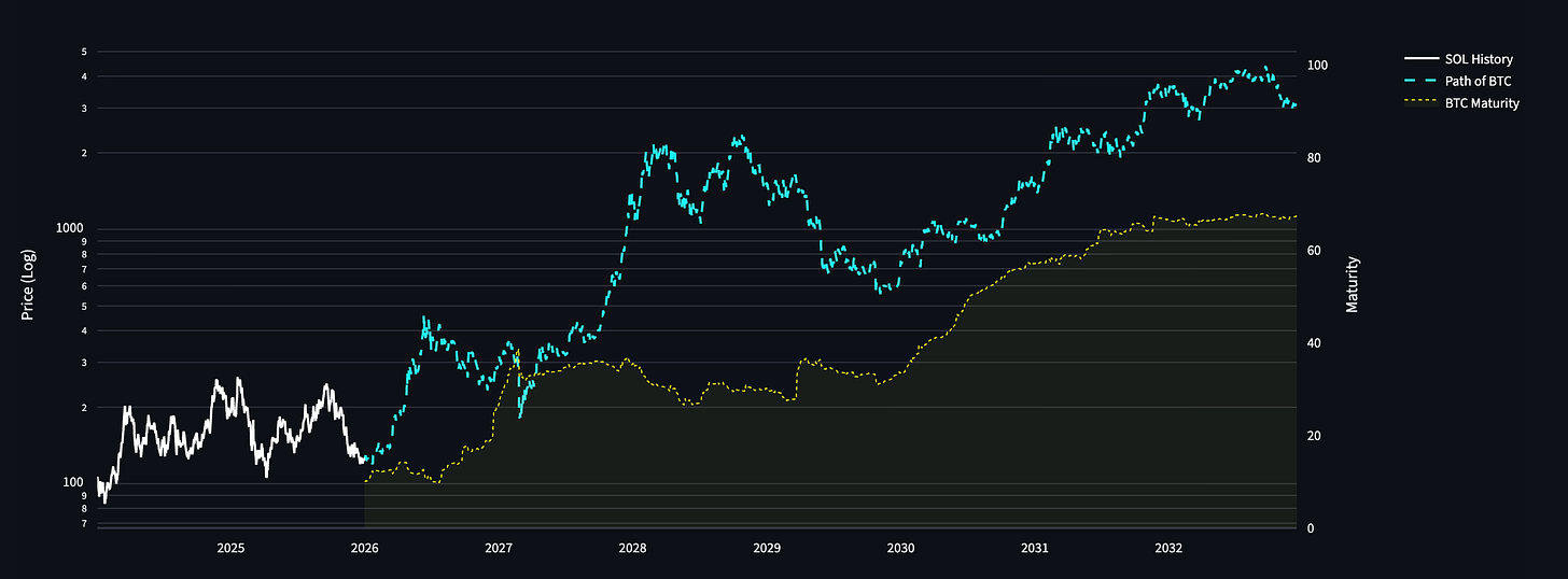 Finalmente, aplicamos nuestro algoritmo para que aprenda de estas curvas históricas y proyecte una trayectoria potencial para Solana.