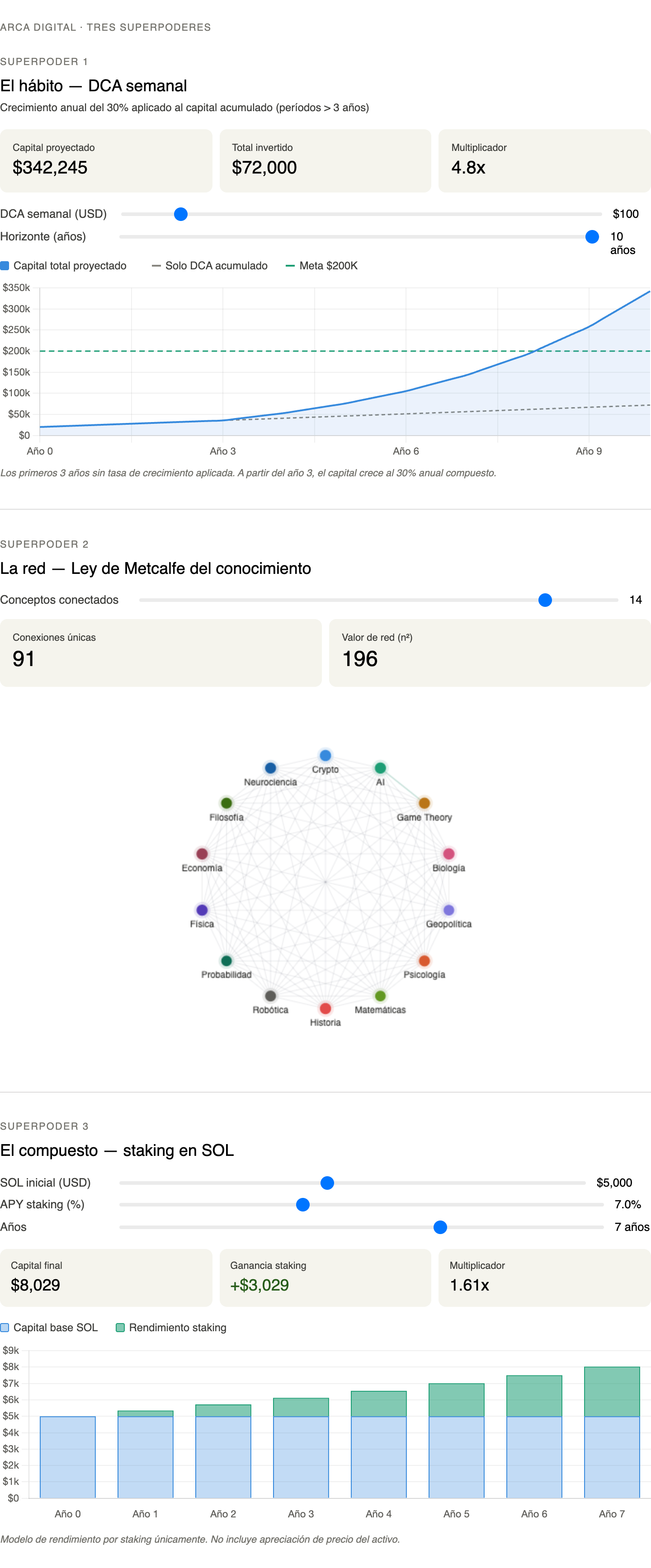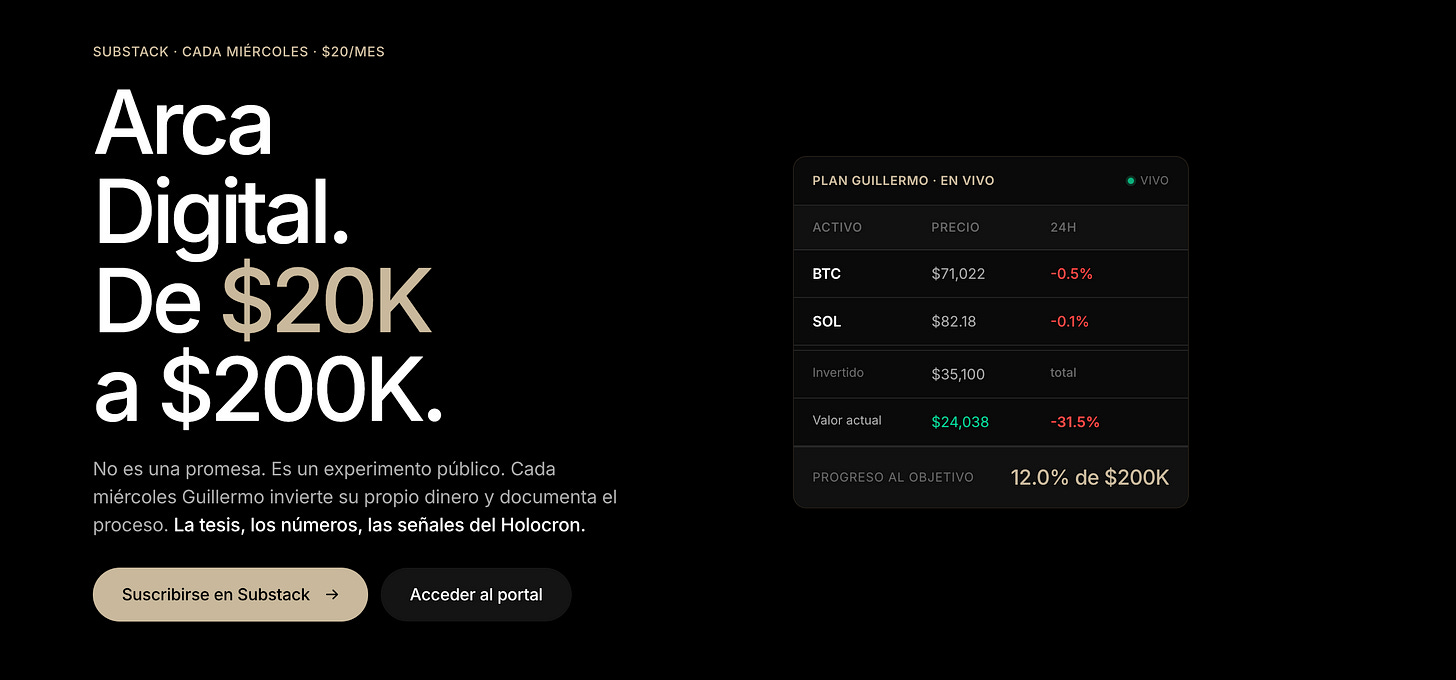Aviso importante: Este contenido es exclusivamente educativo e informativo. No constituye asesoría financiera, de inversión, legal ni fiscal. Las proyecciones de rendimiento son ilustrativas y no garantizan resultados futuros. Los activos criptográficos son altamente volátiles y pueden resultar en pérdida total del capital invertido. Antes de tomar cualquier decisión de inversión, consulta con un asesor financiero certificado. ARCA Digital documenta una experiencia real de inversión — no es una recomendación de compra o venta de ningún activo.