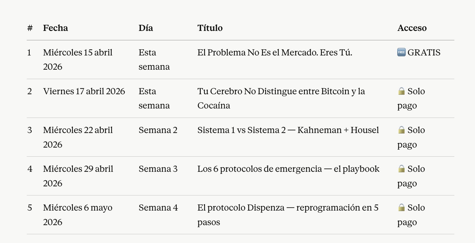 La semana que viene vamos más profundo. ¿Por qué el mercado replica exactamente el mismo circuito neurológico que activa una adicción a las drogas? ¿Por qué la dopamina pica en la anticipación y no en el ATH? ¿Por qué el fondo del bear market se siente biológicamente imposible de aguantar — no psicológicamente, neurológicamente?